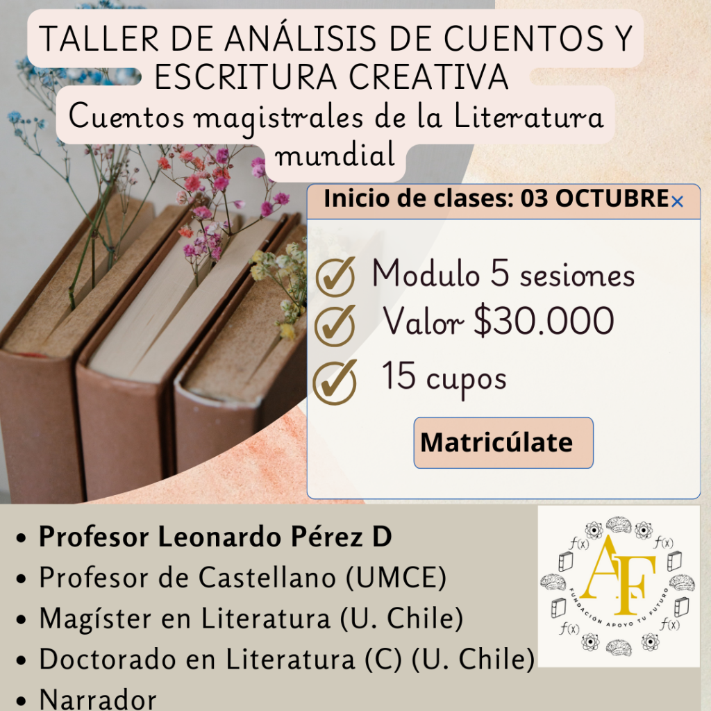 Taller de análisis de cuentos y escritura creativa Matricúlate ahora Un espacio único para explorar los cuentos magistrales de la literatura mundial y desarrollar tus habilidades creativas.